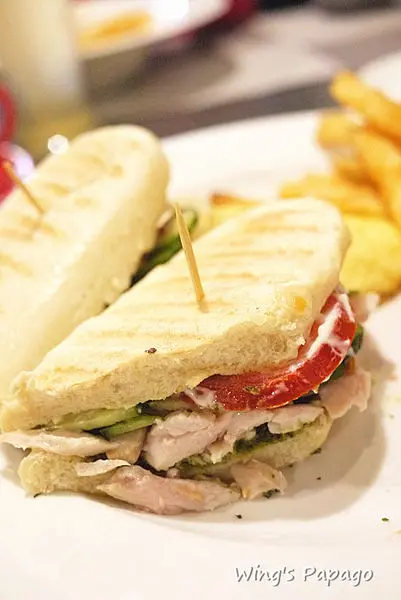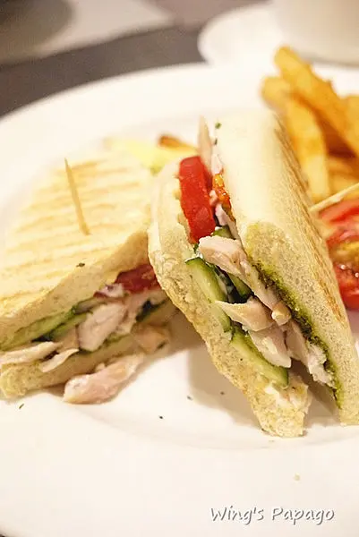抹在帕尼尼上頭的自製青醬抹醬香濃提味,搭配大量燻雞肉片及時蔬,