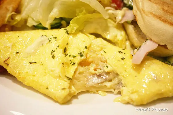 滑嫩的炒蛋中包了甜椒、菇類及起司,嚐來柔滑順口,富有雞蛋香氣。