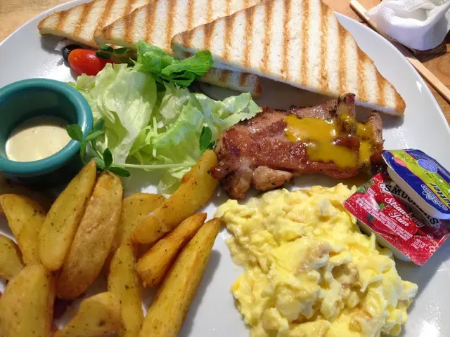 當然標準的三片壓紋吐司加上一塊小塊雞腿肉、帶皮薯條、生菜沙拉、炒蛋