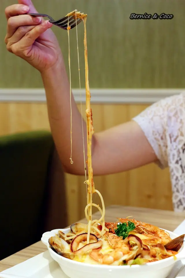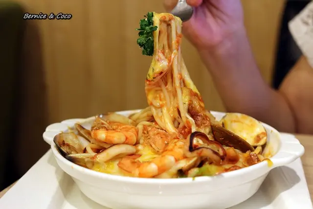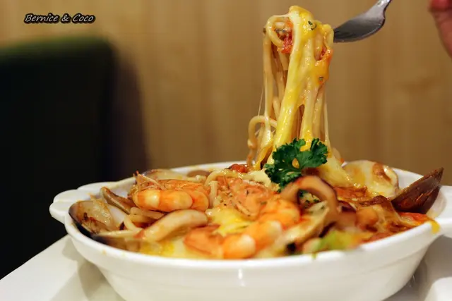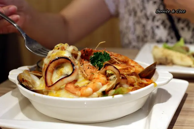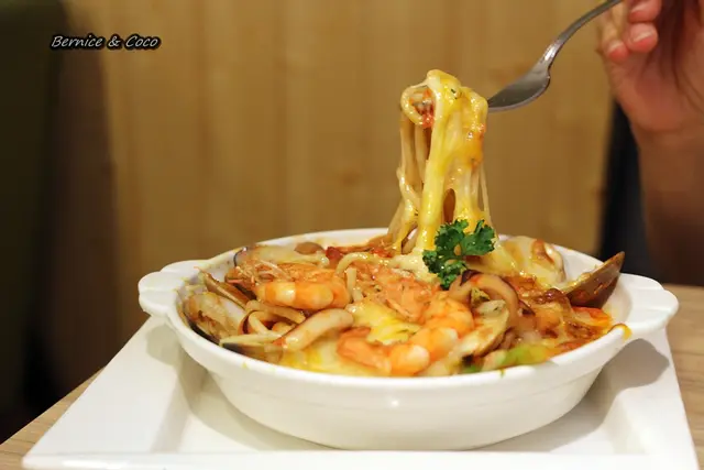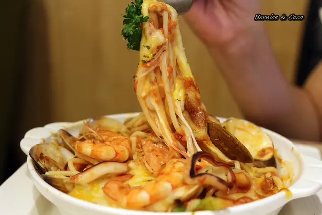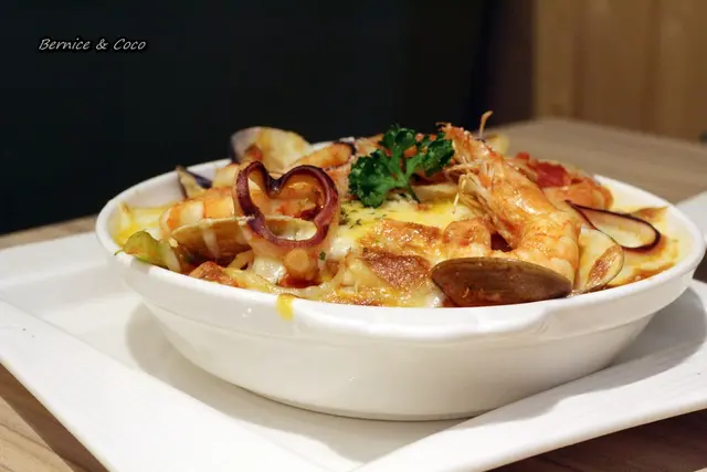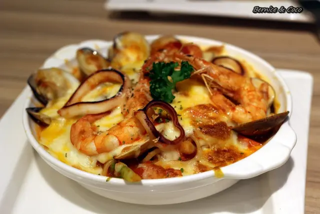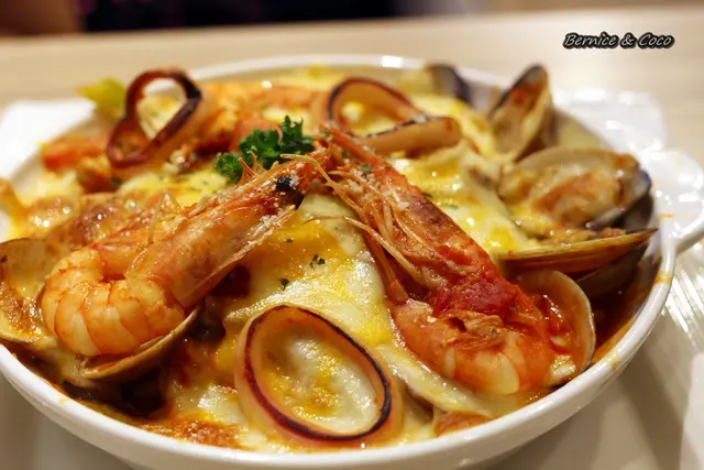 焗烤麵上頭鋪滿了海鮮料,看了就讓人垂延三尺