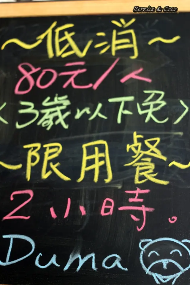 走到大門外,門口有個告示牌,每人低消80(3歲以下免)限用餐2小時