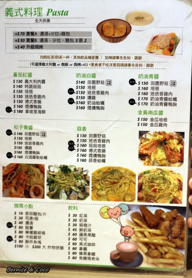 義大利麵和燉飯130~170 輕食類80~110 兒童餐90~120