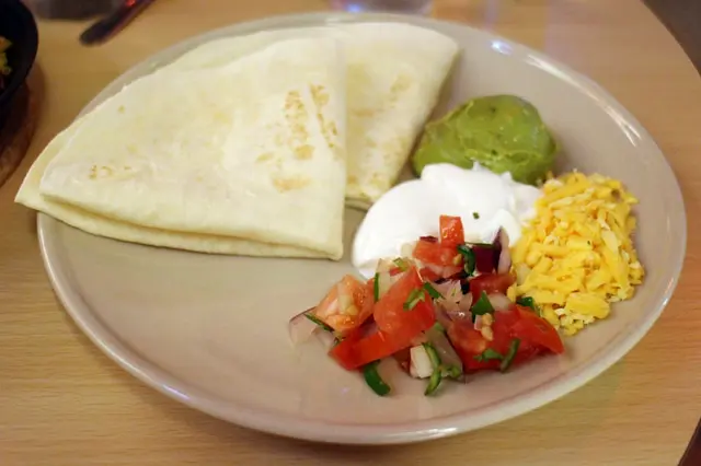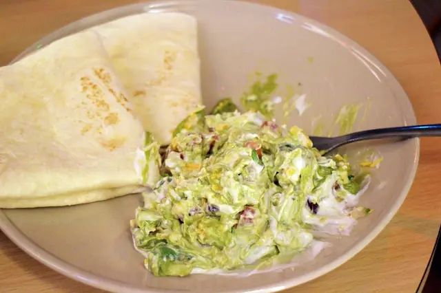 比起潤餅皮大概有五倍厚的墨西哥餅皮,還有酪梨醬 酸奶 切丁時蔬