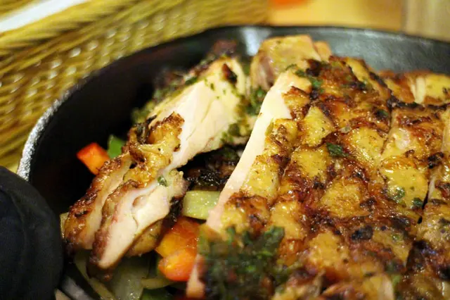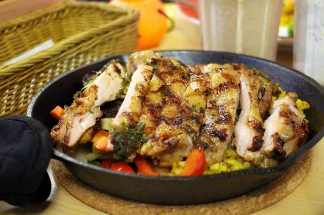 這這這...份量無敵爆炸多的呀!根本可以說是兩道菜了,外皮烤得焦黃酥脆的雞腿肉還有剛剛吃過的薑黃飯,迷人網狀焦痕還有好肥嫩的腿肉,鐵盤直接吃就棒極了