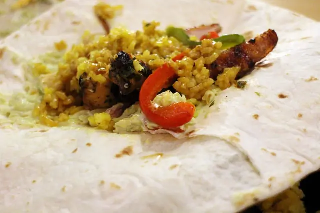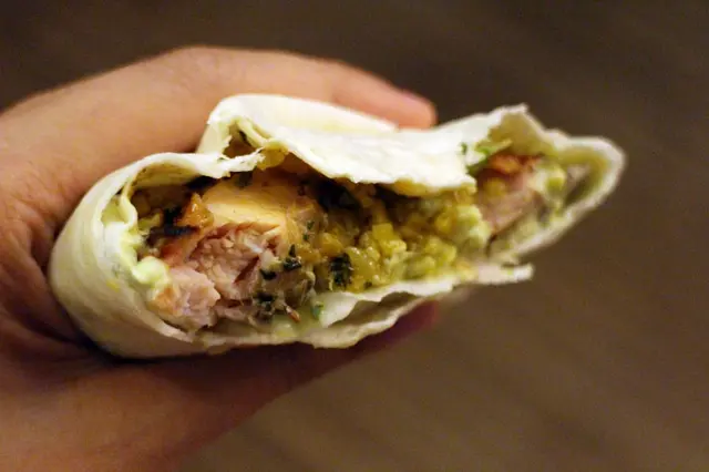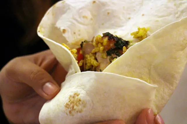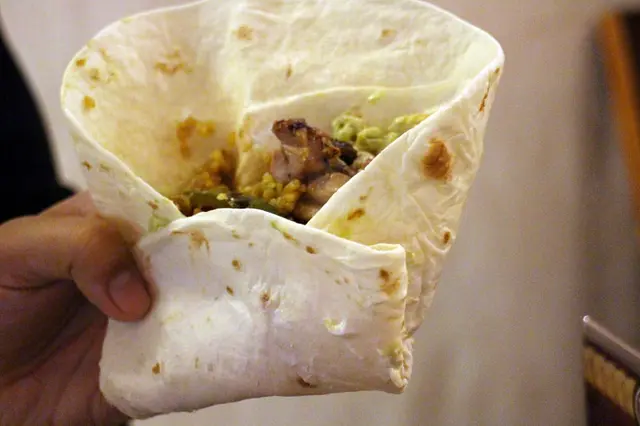 因為墨西哥捲皮厚度很夠,不用擔心醬料濕透沾手,剛剛攪和均勻的醬料濕潤了腿肉和薑黃飯,整體口感非常有層次,好好吃呀!而且還有自己參與料理DIY,想吃多少用多少!