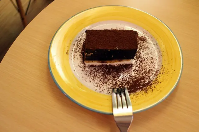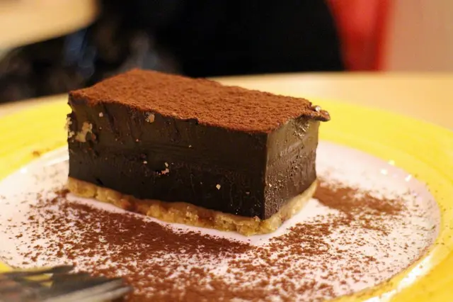這不是巧克力蛋糕啊!是生巧克力吧!餘韻帶苦又綿密,底層是消化餅乾,即便很飽了都值得點一份喔!