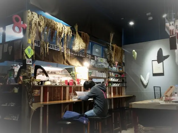 拜訪日期:2014-11-15(六) ➤ 星期六的下午﹐睡到自然醒後懶洋洋地來到了這間【+ing】﹐ 它的前身就是【Together Cafe'】,是由幾位輔大的校友合開的店, 聽名字就覺得很有趣吧!就是英文裡現在進行式的動詞型態~~ 這間店位在一個很不起眼的騎樓﹐大門是鄉下那種木製門﹐有種懷舊的感覺﹐ 裡面的座位也都很有特色﹐有沙發椅有木製椅等等﹐每一組座位的桌椅都很特別。 除了店內的"家具"很特別之外﹐店內擺設的裝飾品也有意思喔! 因為正逢期末考前夕﹐當天有許多學生來這裡念書用電腦。