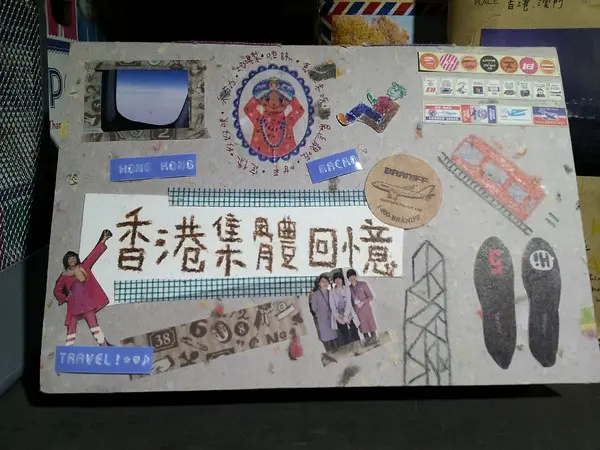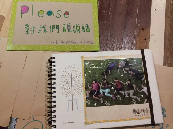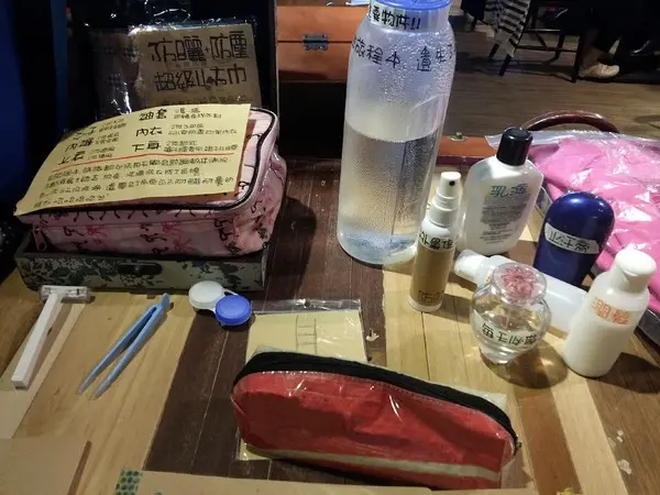 ▲簽名留言專屬的本本 除了旅行愛好者的旅遊手冊、相本所記錄下來的故事外﹐ 只要和旅行相關的物品也能成為店內的裝飾品﹐像是下面這個... ▼旅行用的物品(刮鬍刀、乳液、喝的水、化妝包等...)
