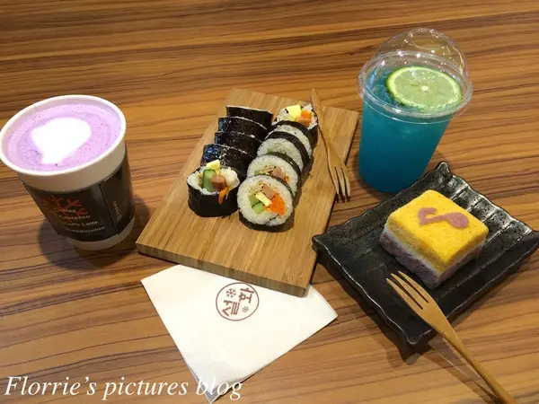 我們端詳了菜單許久後,再加上妹妹因為早起還沒吃早餐的關係,於是我們點了一個原味飯捲、地瓜拿鐵、藍色檸檬汽水以及小份的彩虹蒸糕。點完餐後,店員會給一個震動號碼牌,所以震動時即可取餐,由於大部分餐點是現點現做的關係是需要一點時間等候餐點。