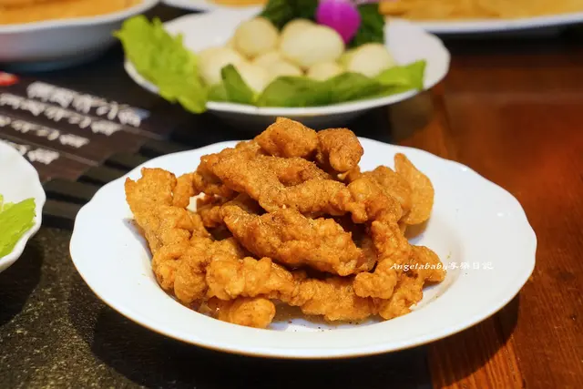 其實是豬肉條裹上麵糊後油炸、單純品嚐口感香有一點肉感、外皮酥中帶點胡椒提香