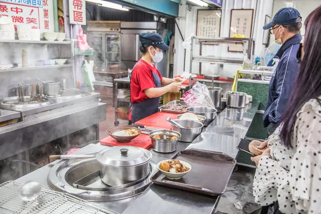 環南米苔目點餐方式跟自助餐很像,就是拿著托盤一站一站走,第一站先跟阿姨講你要主食,米苔目有乾、濕兩種,這裡也有滷肉飯,做好後會把餐點放托盤,接著就去小菜區,同樣也是跟店員說你要什麼,做好放在餐盤上自己端去位置上吃