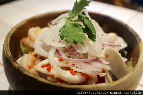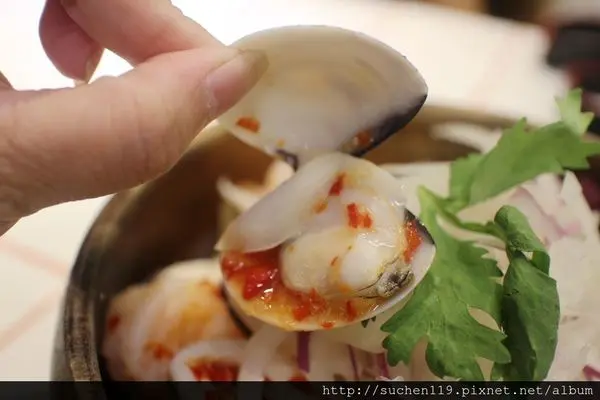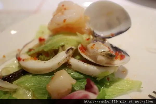 海鮮部份蛤蜊、干貝、蝦子和花枝