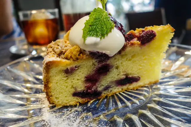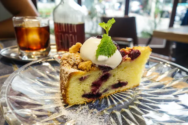 蛋糕的上頭鋪滿邪惡的酥菠蘿烤焙而成配上點點甜甜慢火細熬的綜合莓果醬與溫潤的鮮奶油