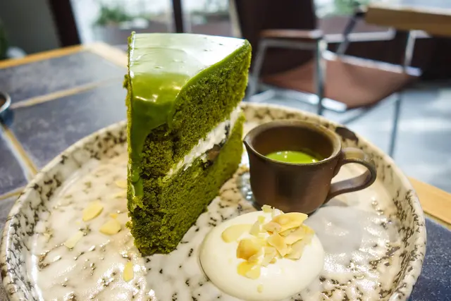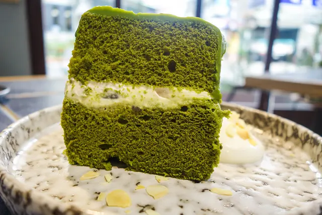 濕潤的戚風蛋糕體內夾有法國頂級伊絲妮鮮奶油與大粒飽滿的大黑豆,配上抹茶白巧克力醬淋在蛋糕上,濃郁的抹茶香中充滿清新淡雅的回甘茶味