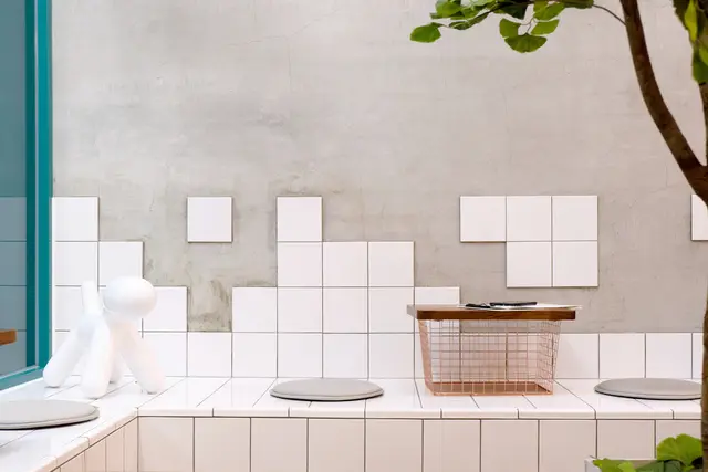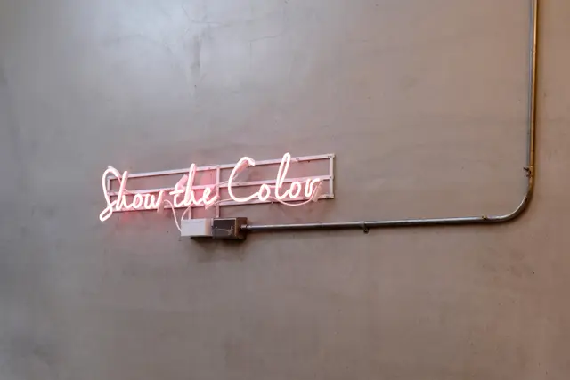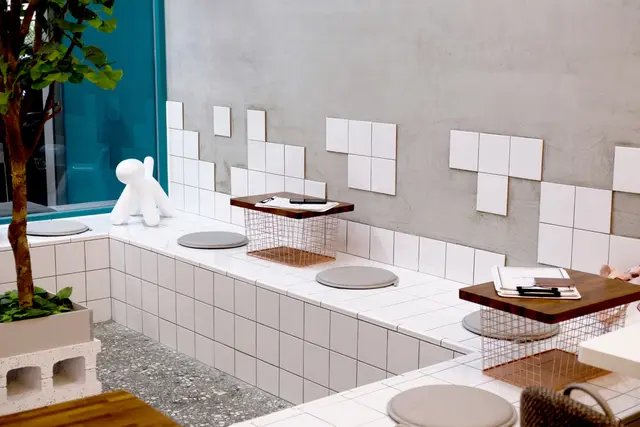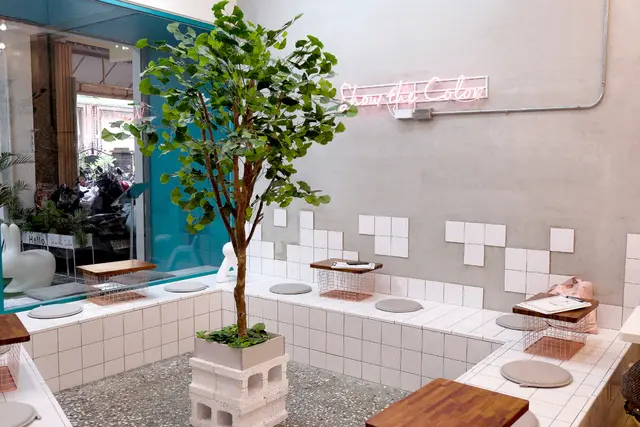 整家店以韓國風格呈現,一進門白磚座區灰牆上,是現在流行的粉紅霓虹燈。