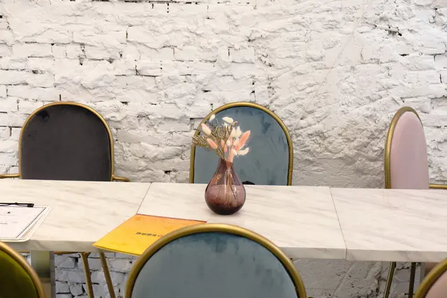 空間內部則是以不同顏色椅子做妝點,每張餐桌上,也擺上乾燥花束。