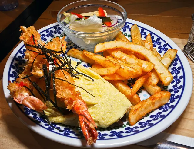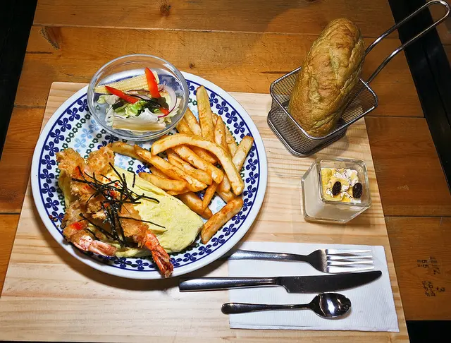 麵包, 兩隻炸蝦,一大塊歐姆蛋, 薯條, 紅茶(沒拍到但它有附飲料)