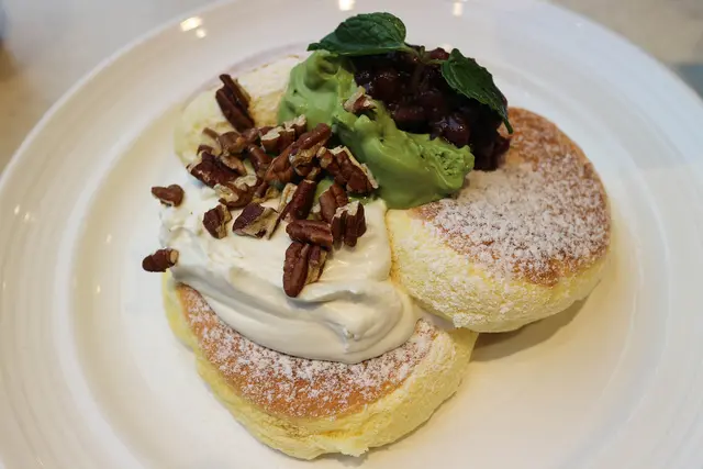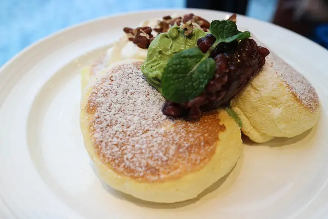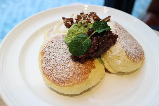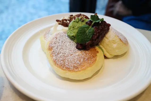 三大塊的鬆餅上搭配了鮮奶油與靜崗抹茶醬與紅豆泥