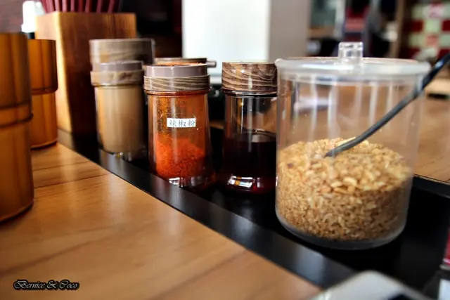一入座就看到桌子的中間放有蒜酥、辣椒粉、胡椒粉和香油