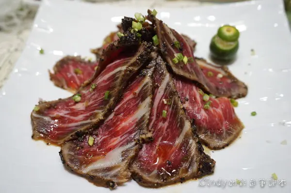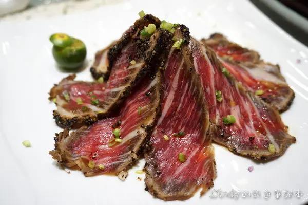 用香料醃過的生牛肉 外層抺上黑胡椒粒 將外層微烤後即上桌