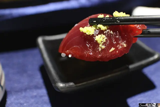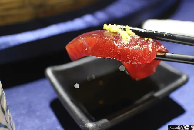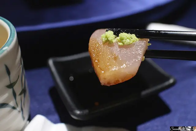 一面放芥末一面沾醬油才能嚐到魚的鮮甜味喔