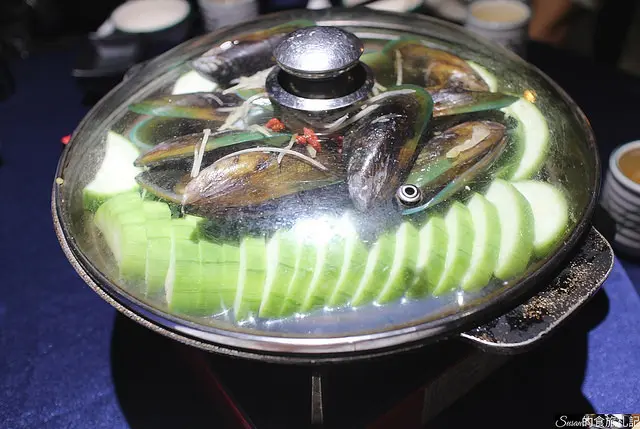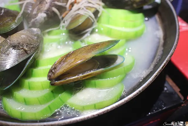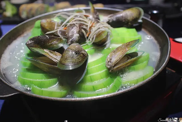 事先蒸熟的孔雀蛤鋪在絲瓜上面一整個很搶眼