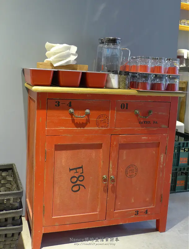 開水/餐具自取區,一旁還有可置放包包的提籃