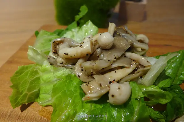 溫沙拉中的菇類以比較重口味的黑胡椒調味過,底部鋪上單純只用橄欖油拌過的生菜