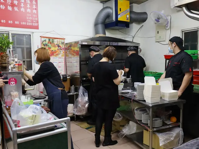 相對店內的座位數,比較令人意外的是正宗岡山羊肉工作人員的配置,比起一般的小吃店來說,實在是出乎意料地多。在開放式的廚房裡,除了站在炒爐前忙到完全無法停手的兩位師傅外,還有許多備料及後場的工作人員,估計有十多人,每個人幾乎都忙到不可開交。而且雖然只是小吃店的規模,每個工作人員統一化的黑制服及帽子,也令人覺得是間很有制度的餐廳。
