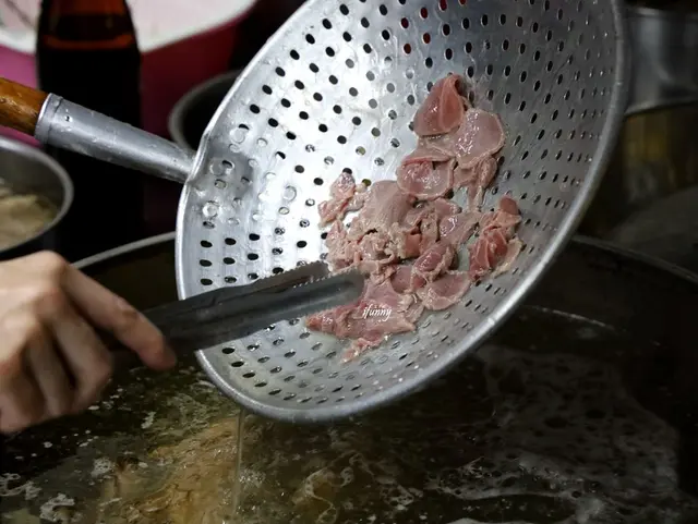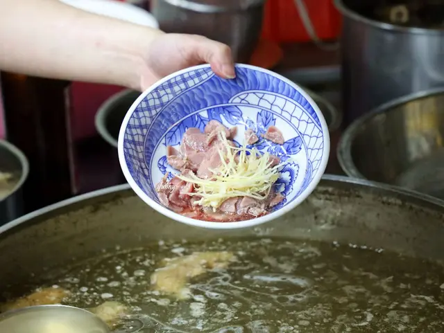 就像台南牛肉湯的吃法,將羊肉片放至清湯中稍微涮過。僅涮幾秒,為保留著羊肉片粉嫩的色澤。
