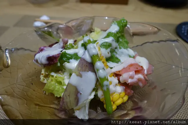 點完菜沒多久後,每個人都上了一樣的沙拉,沙拉醬是屬於帶有水果風味的類優格醬汁跟日式和風醬汁,裡面還有很開胃的醃蘿蔔,莎拉的口味還蠻不錯的,蔬菜也很新鮮。