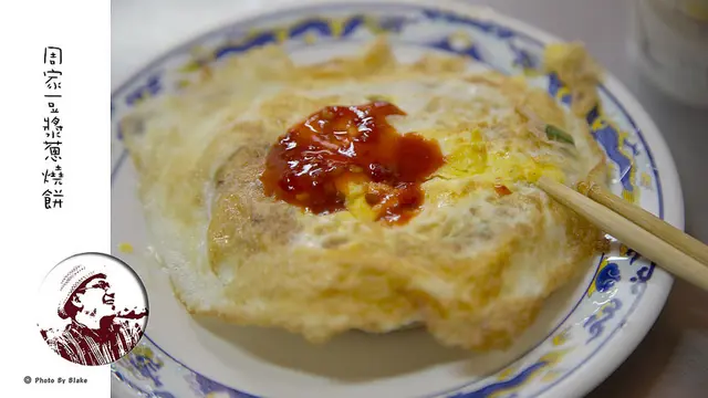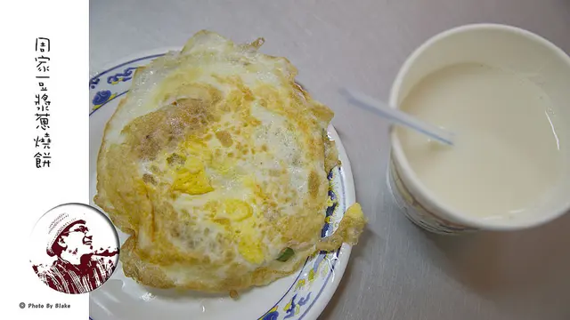 看到菜單上有蛋餅,本以為是跟原本認知的蛋餅一樣,結果是蔥燒餅加蛋,在周記豆漿就是蛋餅,一開始布雷克還不知道怎麼點,只跟阿姨說要蔥燒餅加蛋,煎台的阿姨很利落將蛋打在煎台上,之後在將蔥燒餅放上一同煎。