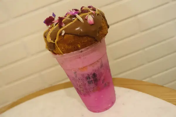 小心翼翼先把可頌甜甜圈取下,一睹粉紅花火燕麥果汁的正面~