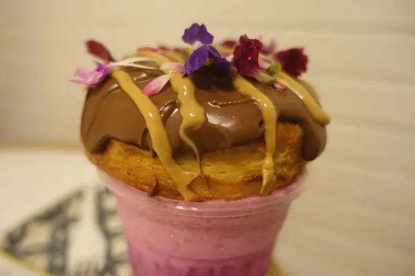 但光是顏色繽紛的燕麥果汁加上無人能敵的可頌甜甜圈蓋子創意,