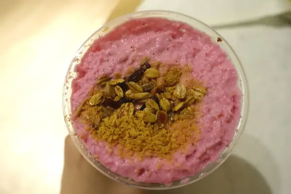 粉紅到不行的果汁基底是由燕麥、火龍果、蘋果、蜂蜜和鮮奶攪拌而成,