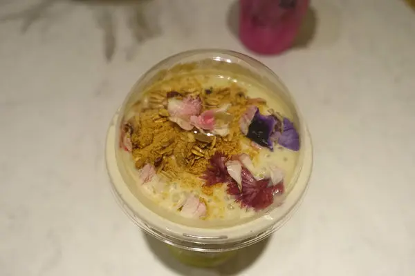 色彩繽紛、灑有五彩花瓣的燕麥果汁已經夠逼人,