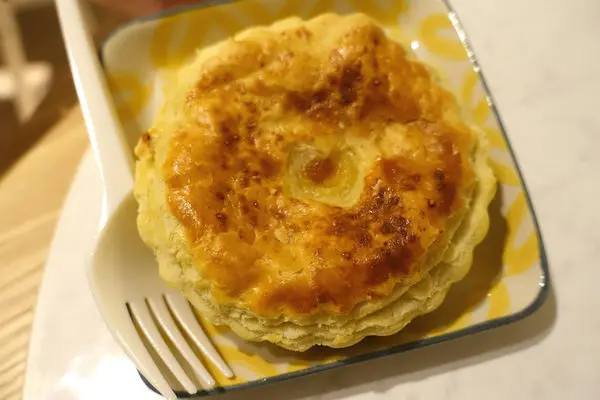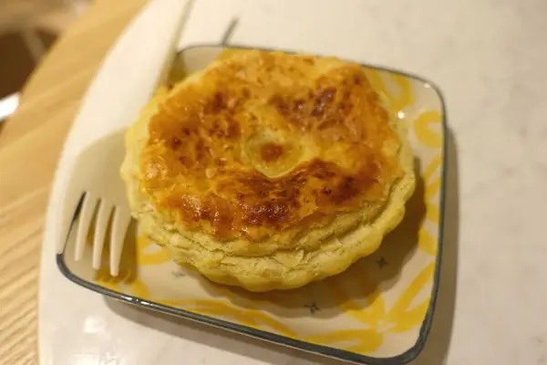 外層金黃的派皮、只用塑膠叉子切下就能聽到嚓嚓的酥脆聲;