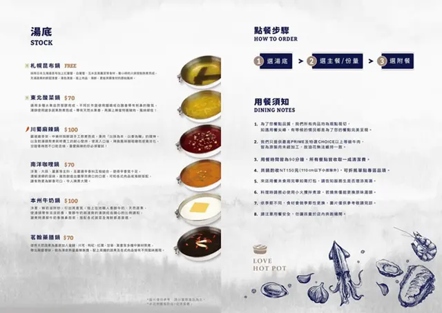 點餐的順序是選湯底、主餐,再選附餐。火鍋湯底有昆布鍋、酸菜鍋、麻辣鍋、咖哩鍋、牛奶鍋及藥膳鍋6種可選擇,其中牛奶鍋推薦為必點。