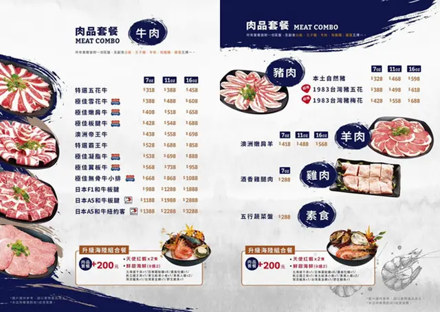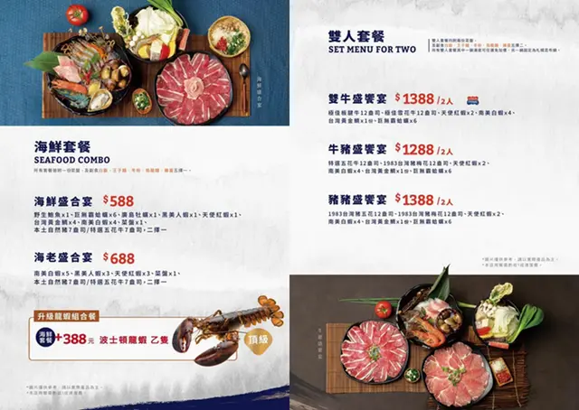 這個套餐包括了:菜盤、野生鮑魚、巨無霸蛤蠣、廣島牡蠣、黑美人蝦、天使紅蝦、台灣黃金鯛、南美白蝦、選有本土自然豬/特選五花牛二選一,另外可從附餐白飯、王子麵、冬粉、烏龍麵、雞蛋中五選一。