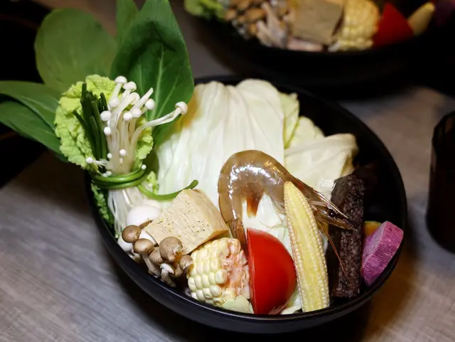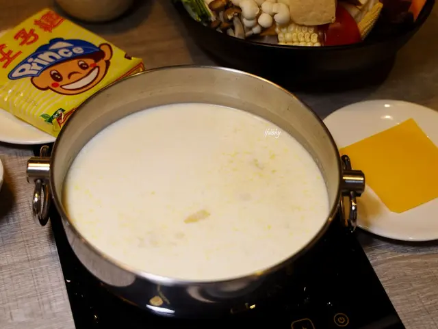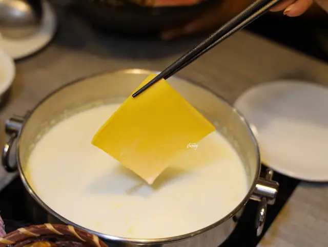 以洋蔥、鮮奶油、各式蔬果並加上職人鮮奶製作而成的牛奶鍋,在上桌前還會再放上一片起司片。看似濃郁的牛奶鍋,入口卻意外地清爽,涮煮海鮮或蔬菜,都相當地適合。
