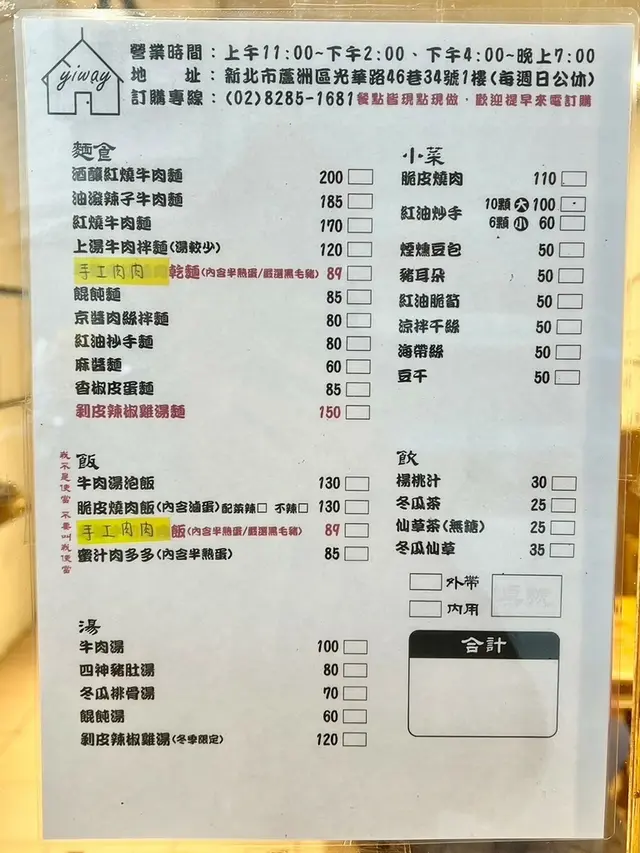 營業時間以周一~周六,我這次周六放假就與朋友一起來,餐點內用外帶都可以,請協助劃單方便老闆出餐,採取自助式服務,點完餐後可以取用餐具及佐料~