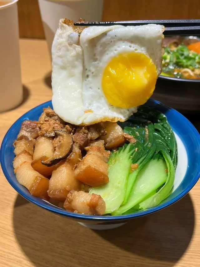 上頭的半熟荷包蛋,戳破後裡頭的蛋黃液徐徐流出,均勻的沾裹米飯,意味廚房的滷汁鹹鹹甜甜,比較偏南部的口味,非常合我口味,吃起來甜而不膩非常的幸福~