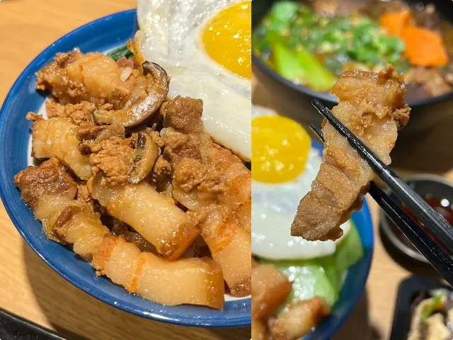 3.嚴選黑豬肉手切肉肉飯,裡頭香菇吸飽滷汁精華,戳破上頭半熟蛋,米飯跟鹹中帶甜的滷汁攪拌均勻,滋味非常迷人,大小朋友吃過都會愛上!