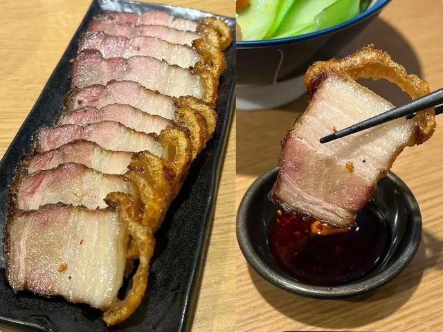 4.吃主食不能少了小菜,脆皮燒肉表皮卡滋卡滋,肉質彈牙不油膩,沾上一點辣椒醬,美味更上一層樓!煙燻豆包也是我的菜,一上桌就聞到香氣,豆皮濕潤入味,配飯配麵都好吃