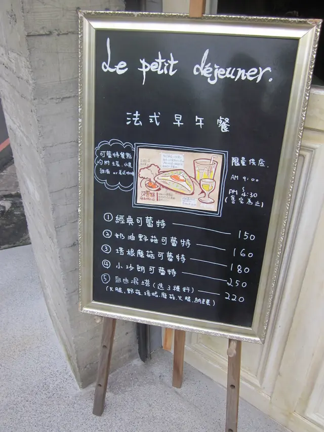 提供的餐點有法式薄餅、早午餐、簡餐、帕尼尼三明治輕食等等,也有配合下午茶的甜點蛋糕,飲品則有咖啡、果汁和進口法國茶。