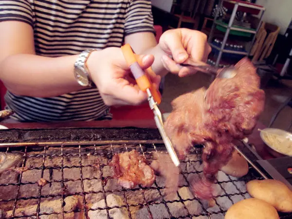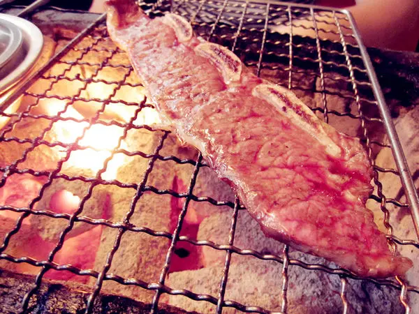 厚實的虎紋牛小排還得用剪刀剪開,烤個七八熟,口感更熟韌。