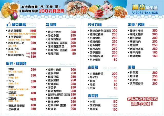 阿杰的菜單上大部分都有標出明確的價格,而部分的活體海鮮會是以「時價」計價,也可以依照人數請阿杰老闆推薦適合的料理,價格非常透明。