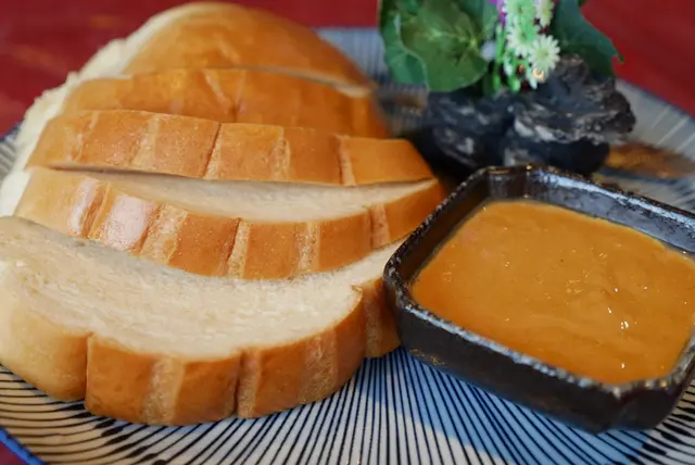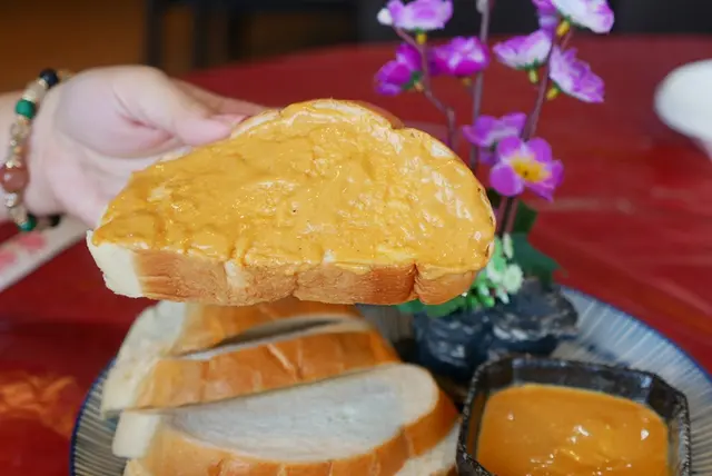 將咖哩沾醬塗在麵包上,每一口都能吃到蟹黃咖哩的香氣,一口接一口越嚼越香,好吃又有飽足感,很適合當一道主菜。