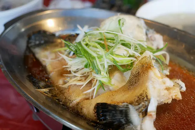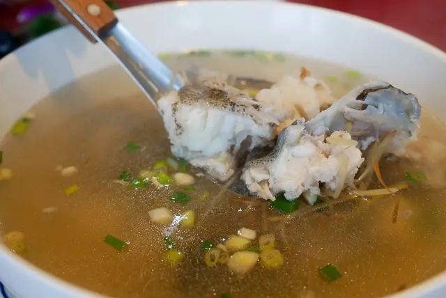 老闆會根據店裡現有漁貨推薦魚湯的種類,我們這次是使用龍虎班下去料理。新鮮的魚肉加點薑和蔥下去提味,湯頭非常鮮甜,