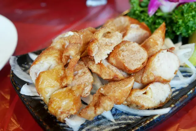 感覺是炸過的雞肉捲,吃以來肉汁非常飽滿,搭配洋蔥一起吃,很爽口~